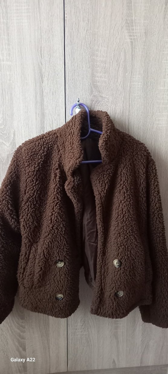 Kahverengi peluş kumaştan, kürk detaylı, notched lapel yakalı, bol kesim ve midi uzunlukta kadın ceket. Günlük kullanıma uygun, rahat ve şık görünümlü.