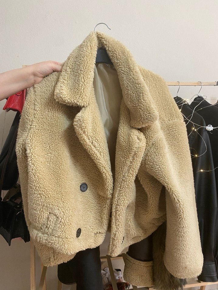 Kahverengi midi ceket, peluş ve kürk detaylı, gevşek kesim ve notched yaka ile sıcak ve rahat bir stil sunar.