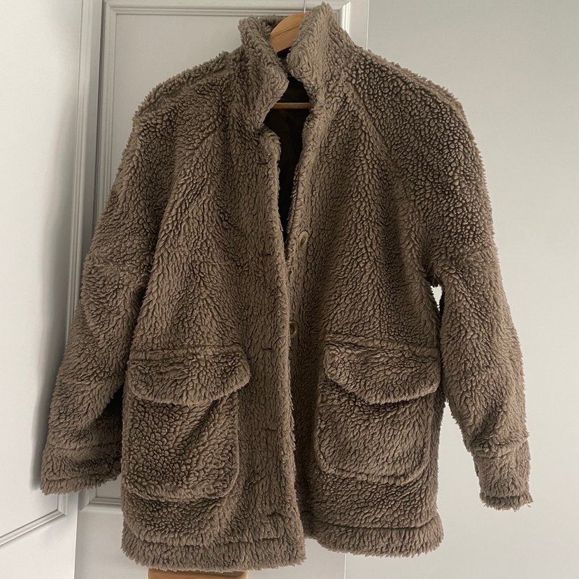 Kahverengi peluş, uzun kollu, gevşek kesim kadın midi ceket. Yakası kesik ve cep detayları bulunur, günlük kullanım için uygundur.