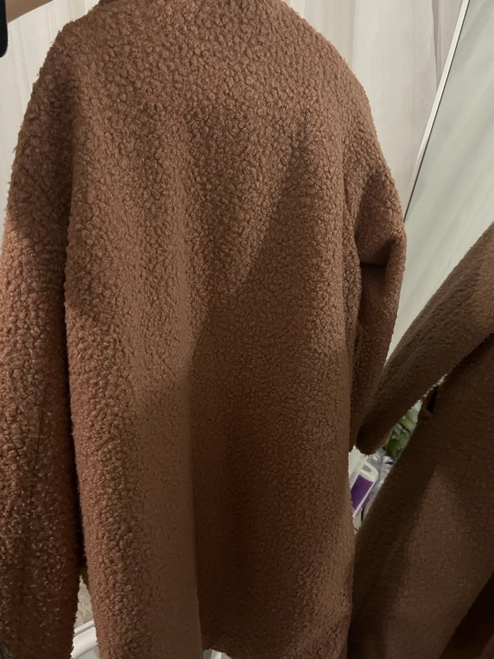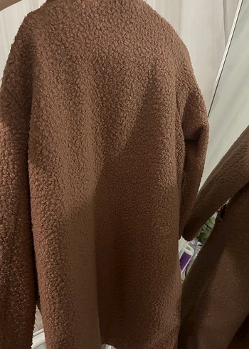 Kahverengi, yumuşak ve sıcak dokulu, kürklü detaylı, boğazlı ve bol kesim midi uzunluğunda kadın kabanı.