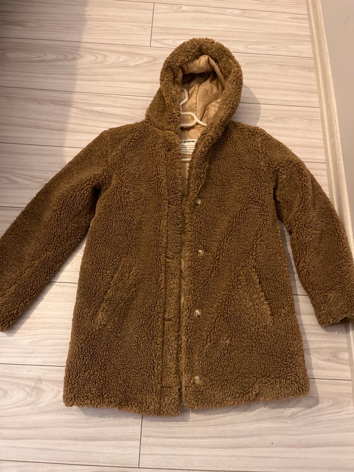 Kahverengi peluş dokulu, bol kesim ve uzun kollu midi kaban. Rahat ve desensiz, yakası kesik detaylı, günlük kullanım için uygundur.Ürün yalnızca birkaç kez giyilmiştir