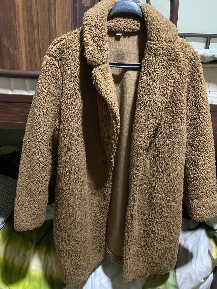 Kahverengi, parlak, midi uzunlukta kadın kaban, bol kesim, kesik yaka ve uzun kolludur. Yumuşak peluş kumaştan yapılmış, kürk detaylıdır, rahat sokak stili için uygundur Sadece 1 kere giydim bu tonda başka kabanım olduğu için satıyorum 1,500 aldım 900 satıyorum S - M bedene uygundur