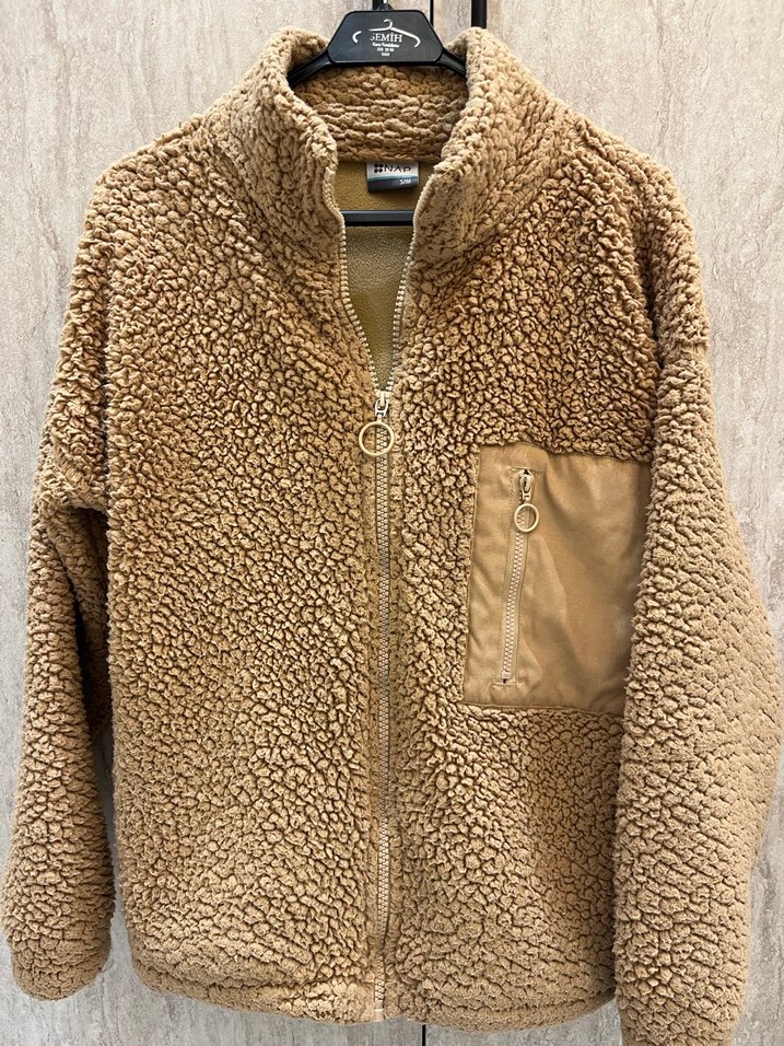 Kahverengi peluş kumaştan, uzun kollu, bol kesim kadın mont. Parlak fermuarlı göğüs cebi ve yuvarlak yaka detaylarıyla günlük rahat stil için uygun.