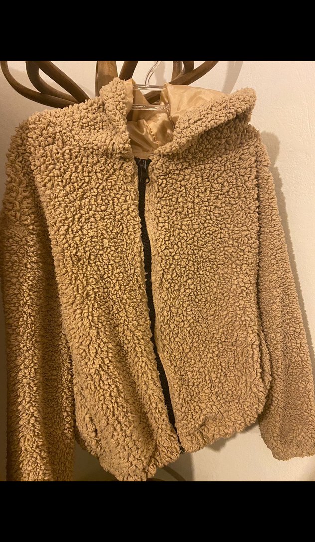 Kahverengi, kapüşonlu, uzun kollu kadın ceketi, yumuşak ve sıcak kumaştan yapılmıştır. Salaş kesim ve midi boyda, parıltılı kürk detaylı, rahat sokak tarzı.