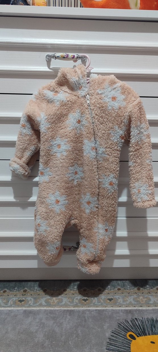 Pastel kahverengi tie-dye desenli, yumuşak peluş detaylı kız bebek tulumu, uzun kollu ve ön fermuarlıdır.