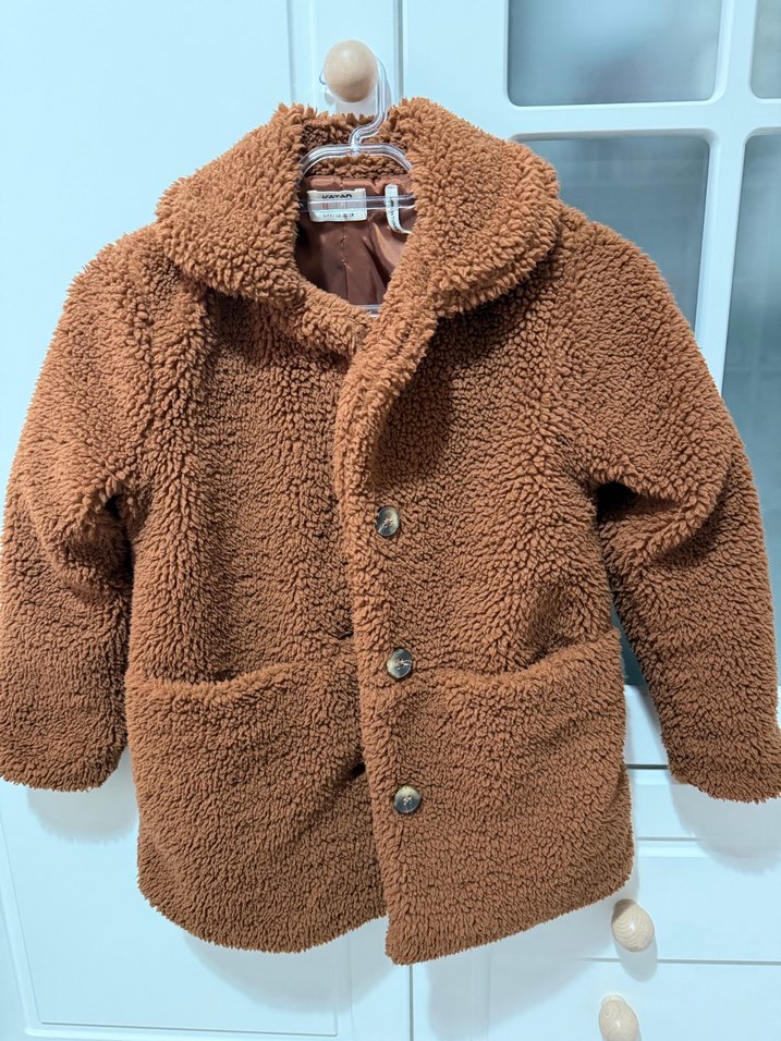 Kahverengi, peluş dokulu, geniş kesim kız çocuk montu. Notlu yaka detayı ve sade tasarımıyla dikkat çeker. 6-7 yaş. Herhangi bir kusuru yoktur. Yeni gibi.