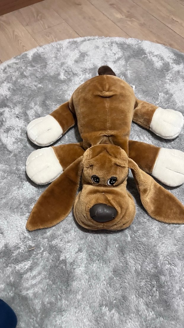 Kahverengi peluş köpek oyuncak, uzun kulaklı ve yumuşak kumaştan yapılmıştır. Beyaz pati detayları ve sevimli yüz ifadesi bulunur.