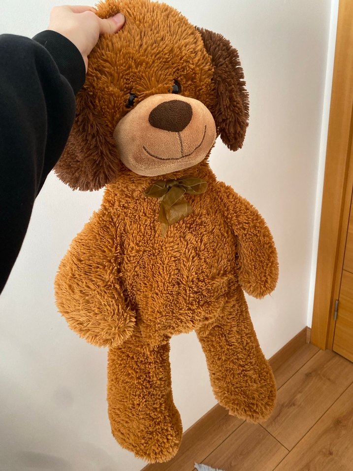 Yumuşak ve kabarık koyu kahverengi peluş köpek oyuncak, sevimli yüzü ve boynunda kurdele ile. Sarılmak için ideal. Boyu 90 cm.