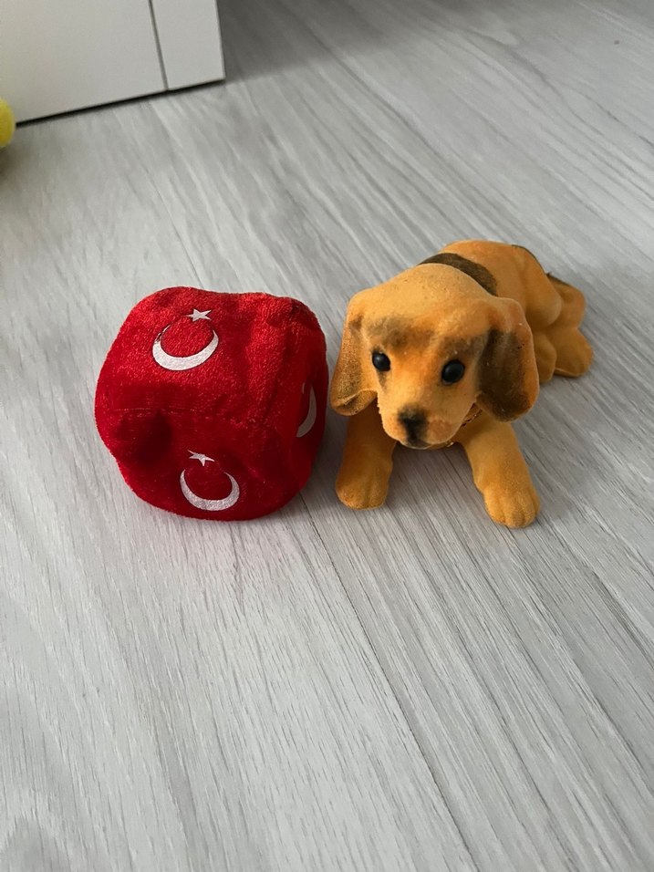 Kahverengi peluş köpek oyuncak ve Türk bayrağı desenli renkli kırmızı zar. Yumuşak ve sevimli peluş oyuncak.