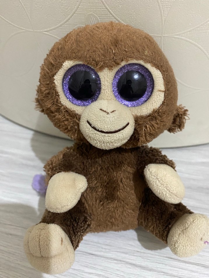 Büyük mor gözlere sahip koyu kahverengi peluş maymun oyuncak, yumuşak kumaştan yapılmıştır.
