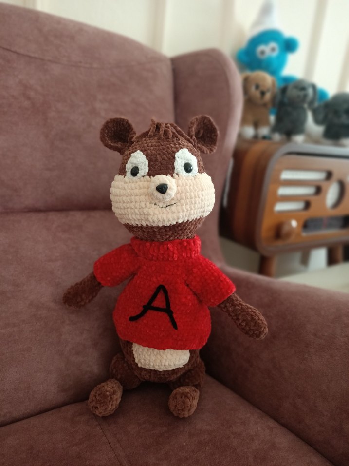 Kırmızı kazaklı, üzerinde 'A' harfi bulunan kahverengi peluş oyuncak Alvin ve sincaplar dan Alvin. Yumuşak dokusu ve renkli detayları vardır. Kadife ip ile örtülmüştür büyük boyutludur.