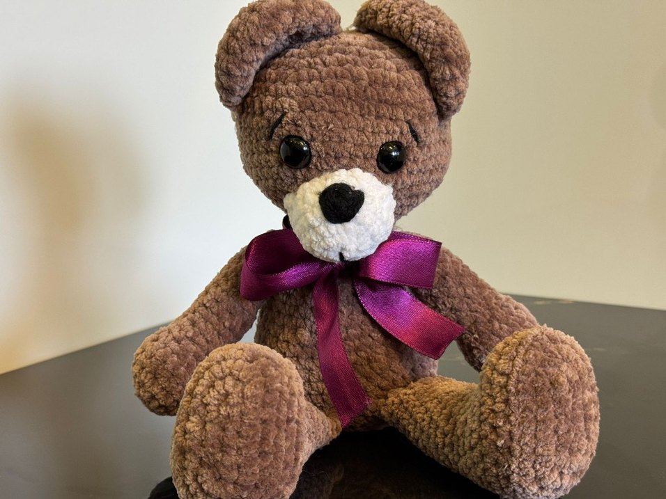 Yumuşak dokulu kahverengi peluş oyuncak ayı, canlı mor fiyonk detayıyla. Büyük siyah gözleri ve beyaz burun kısmı bulunur.