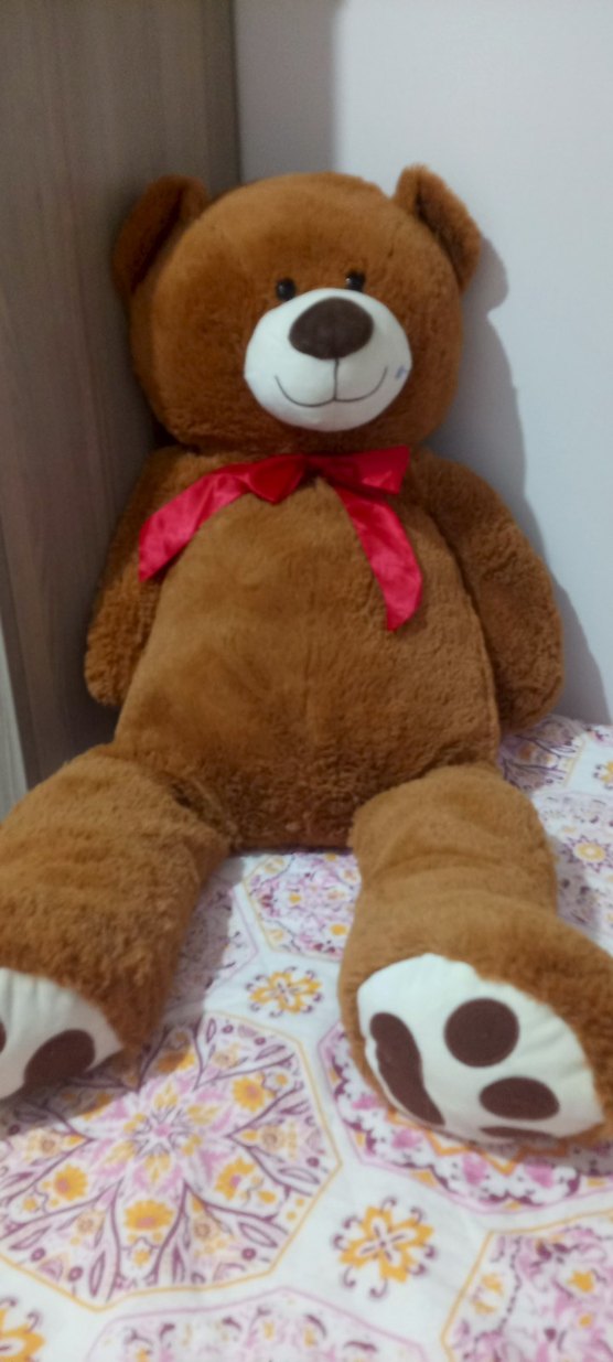 Yumuşak kahverengi peluş oyuncak ayı, boynunda renkli kırmızı kurdele ile. Dost canlısı yüzü ve büyük patileri var.