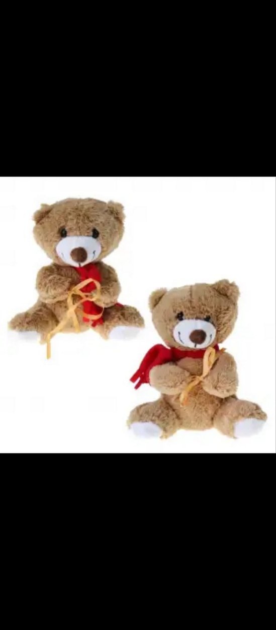 Kırmızı atkı ve gri detaylara sahip yumuşak kahverengi peluş oyuncak ayı. Rahat tutuş için uygundur.