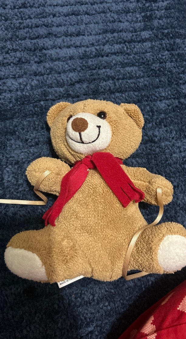 Yumuşak dokulu kahverengi peluş oyuncak ayı, kırmızı atkı ve neşeli gülümsemesiyle renkli detaylara sahip.
