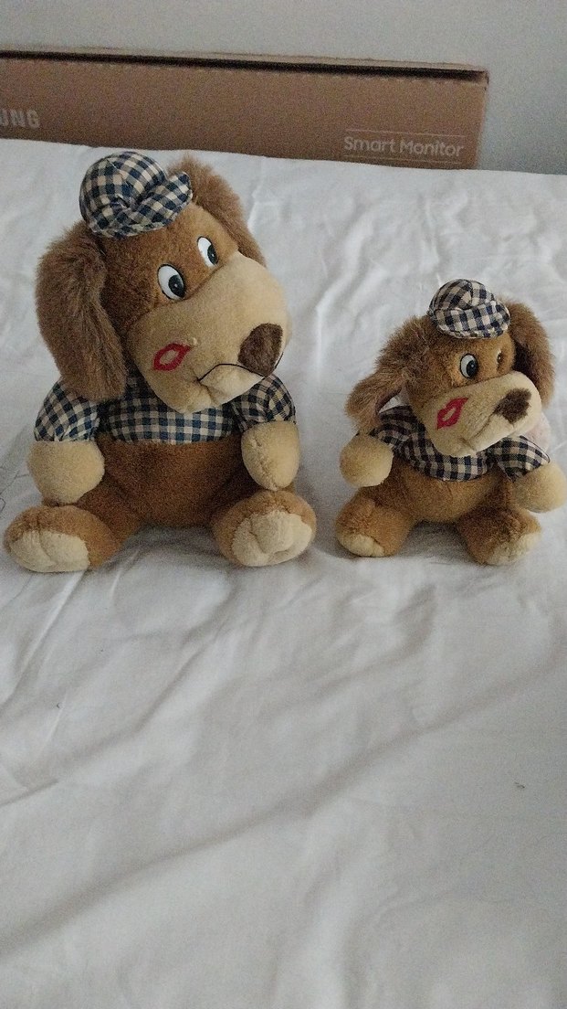 Kahverengi peluş iki köpek, gri kareli şapka ve fularlarla, yanında küçük gri peluş emzikli koyun bulunur. hepsi yada tek tek verılecektır