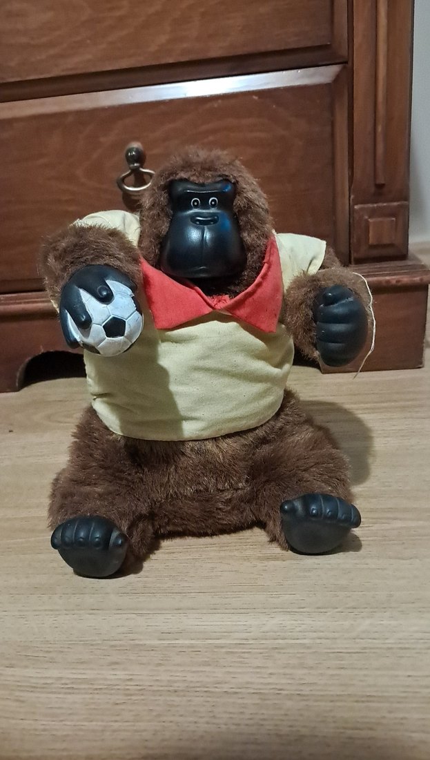 Kahverengi peluş maymun oyuncak, kırmızı yakalı bej gömlek giyiyor ve küçük bir futbol topu tutuyor. Yumuşak ve detaylı siyah yüz ve ellere sahip.
