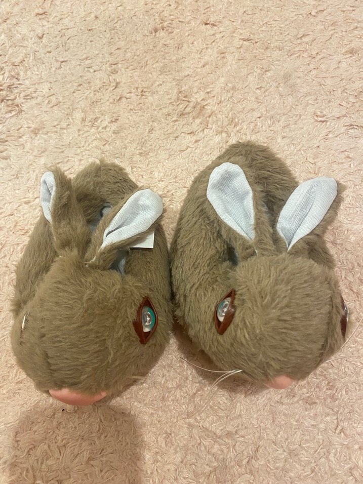 Kahverengi, peluş dokulu ve kulak detaylı tavşan figürlü, kızlar için sıcak ev terliği.