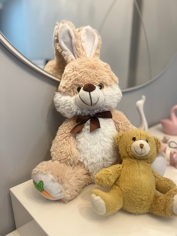 Pastel tonlarda yumuşak kahverengi peluş tavşan, pati üzerindeiki adet havuç detayı ve boynunda kahverengi kurdele ile.