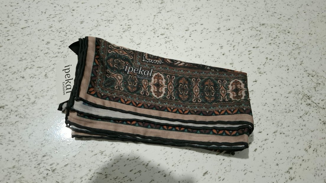 Kahverengi, pileli detaylara sahip bohem tarzda kadın eşarp. Yumuşak sentetik kumaştan yapılmıştır, retro ve hippie havası taşır.