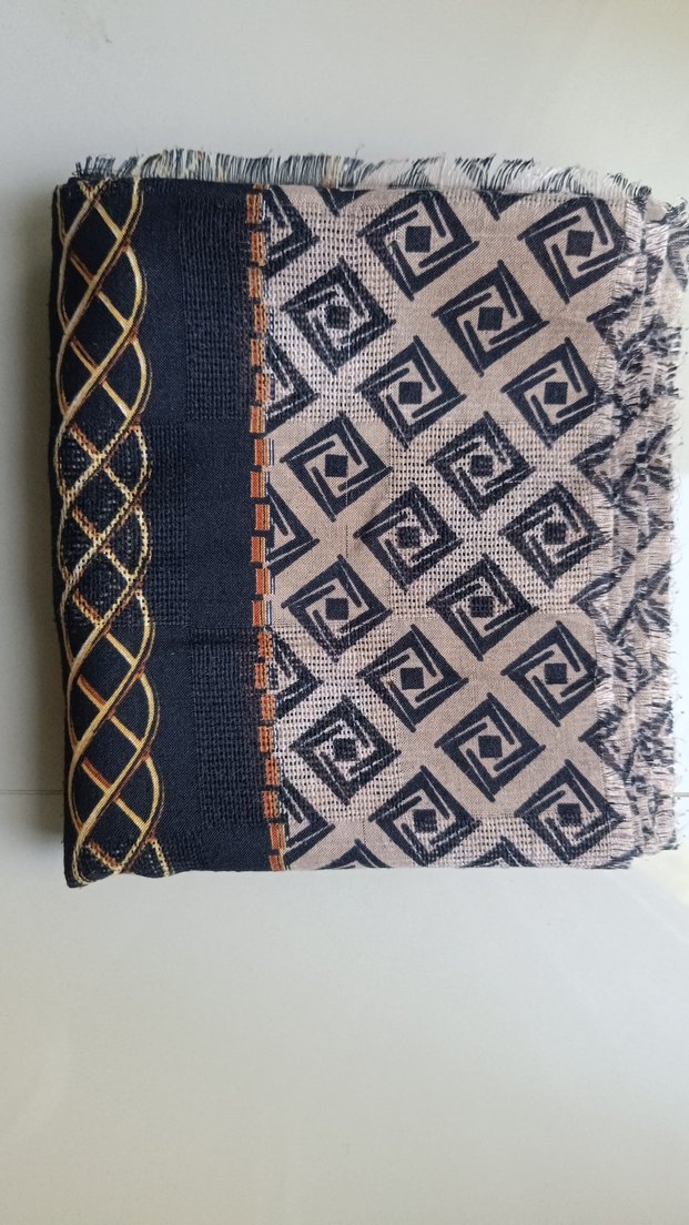 Kahverengi, pileli ve bohem desenlere sahip kadın şalı, sentetik kumaştan üretilmiştir.