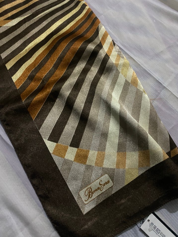 Bu, *Bona Sera* markasına ait, polyester saten kumaştan yapılmış şık bir eşarp. Parlak dokusu, kahve ve altın tonlarındaki çizgili deseniyle hem günlük hem özel gün kombinlerine uyum sağlar. Kolay şekil alır, tok durur ve zarif bir görünüm sunar. Hiç kullanılmadı etiketi üzerinde
