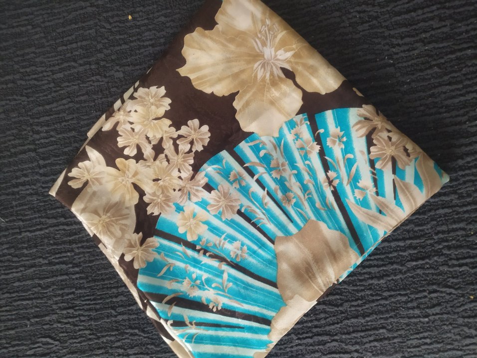 Kahverengi, pileli, çiçek desenli ve mavi detaylı ipek fular, vintage bohem tarzını yansıtır.