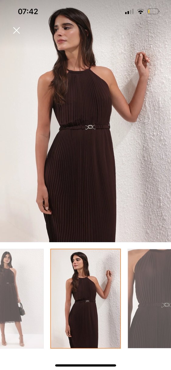 Kahverengi midi abiye elbise, pileli tasarımı, yüksek yakası ve askılı kolları ile minimal ve klasik şıklık sunar. Romantik akşamlar için uygundur. / Ürün bana bol geldi, aciliyeti olduğu için iade etmekle uğraşmadan M bedenini aldım. Ürün iade süresini kaçırdığım için elimde kaldı hiç kullanılmadı. M bedeni de satılıktır