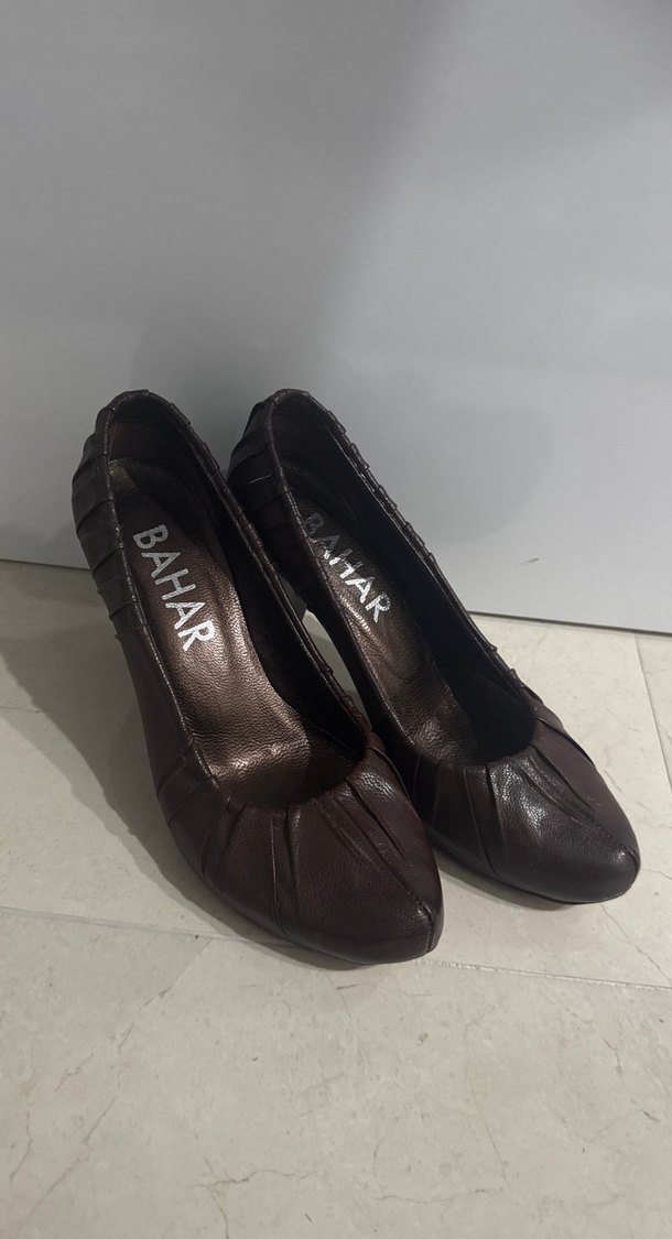 Kahverengi, kauçuk malzemeden yapılmış pileli stiletto topuklu ayakkabılar. İç kısmında BAHAR yazısı bulunur. Ofis için uygun, koyu renkli ve goth tarzında.