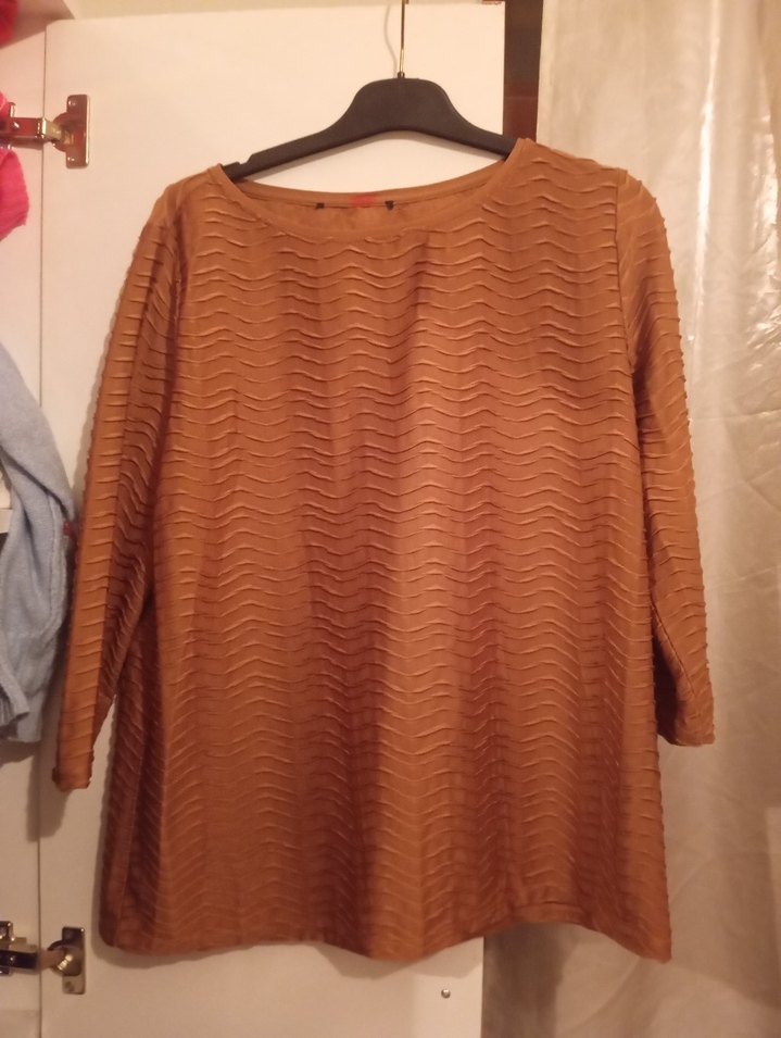 Uzun kollu, kayık yaka, pilili detaylara sahip kahverengi bol kesim bluzu. Yumuşak keten kumaştan, günlük kullanım için uygun.