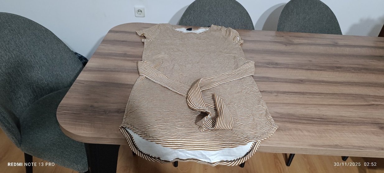Yumuşak keten kumaştan, uzun kollu, bisiklet yaka, pilili kahverengi çizgili bol kesim hamile tişört. Rahat sokak stili için uygun.