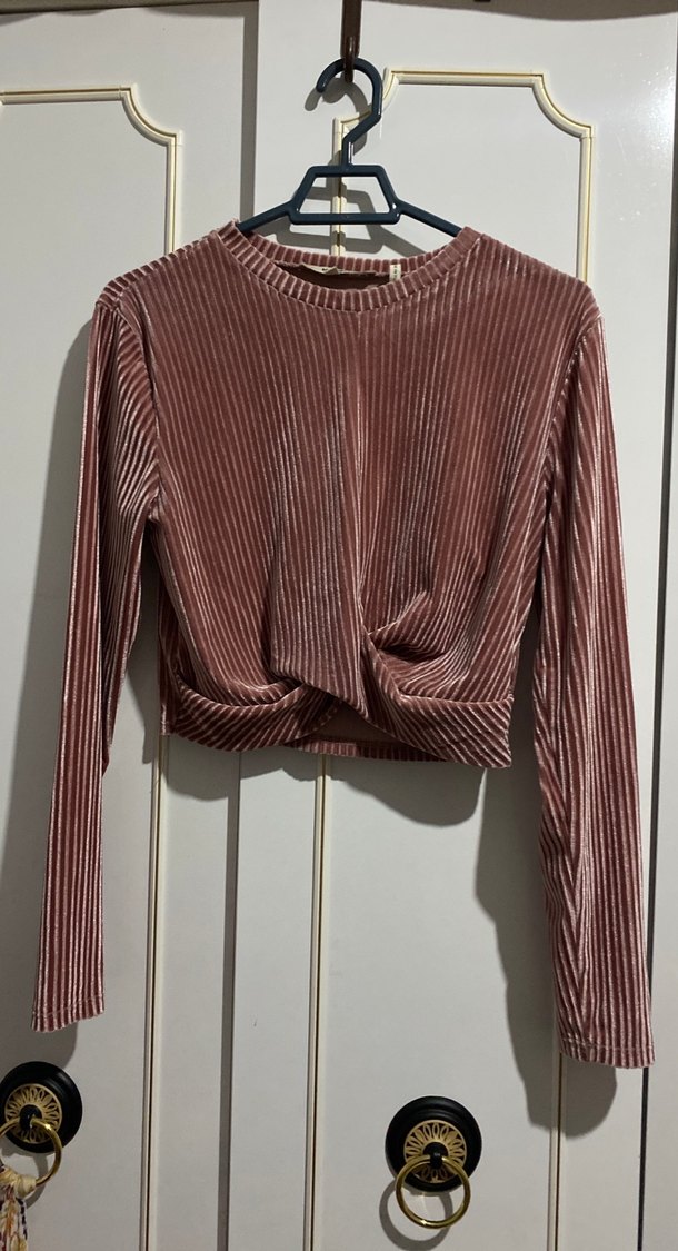 Kahverengi sentetik kumaştan, pilili, uzun kollu, bisiklet yaka, normal midi uzunlukta ve belde bükümlü detaylı, dar kesim kadın bluz.
