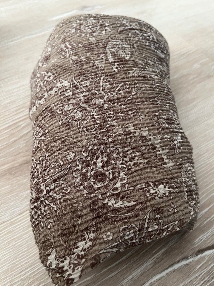 Kahverengi keten kumaştan yapılmış kadın şalı, pilili detaylara ve bohem çiçek desenine sahiptir. Rahat, retro tarzda sıcak bir görünüm sunar. #freschscarfs