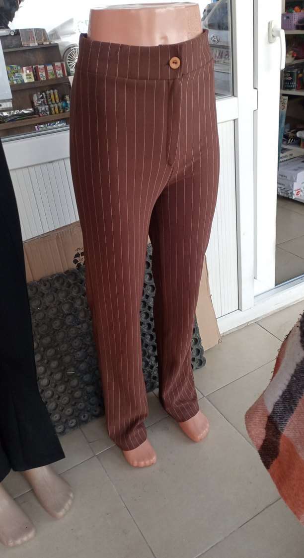 Kahverengi pilili kadın kumaş pantolon, normal boy midi kesim ve parlak görünüme sahiptir. Ofis ve sokak stiline uygundur, sentetik kumaştan üretilmiştir.
