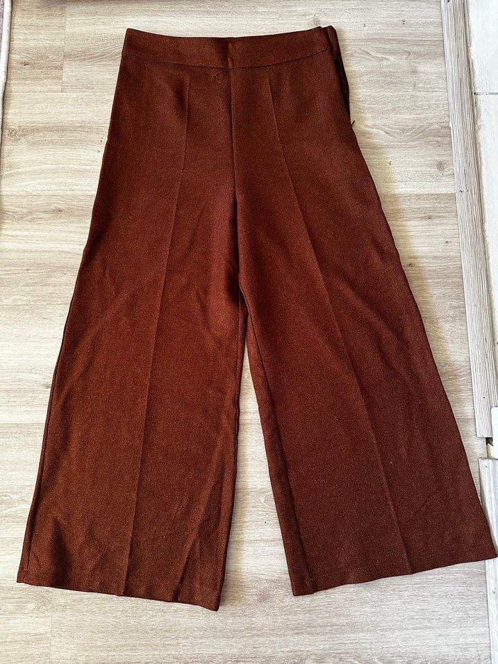 Kahverengi, pilili, midi boy, düz kesim kadın kumaş pantolon. Rahat ve şık, ofis için uygun normcore tarzında.bol paça yüksek bel pantolon