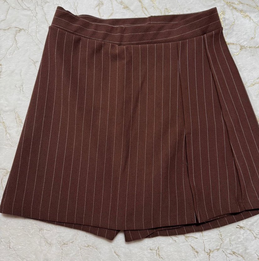 Kahverengi, ince çizgili ve pilili midi boy kadın şort etek. Sentetik kumaştan, normal kesim ve ofis kullanımı için uygun bir Paris tarzı sokak modası parçası.