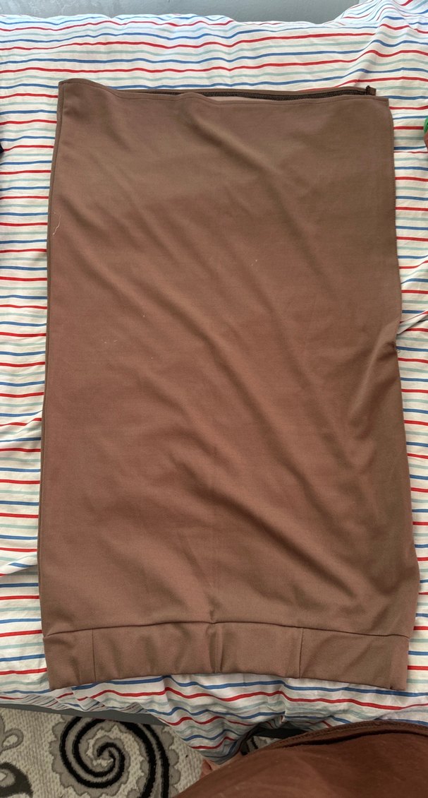 Yumuşak sentetik kumaştan, pilili, kahverengi, normal boyda, dar kesim yırtmaçlı etek günlük kullanıma uygun.
