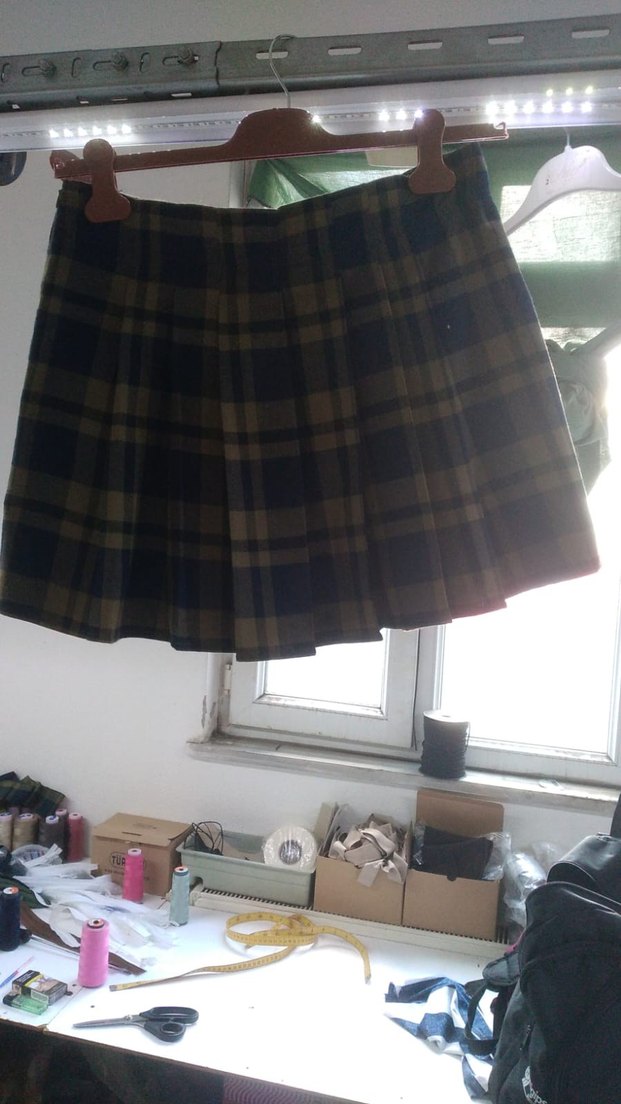 Kahverengi yünden yapılmış, pilili ve midi boyda bol kesim bir etek. Vintage tarzını yansıtır, günlük kullanıma uygundur. özel yspimdir