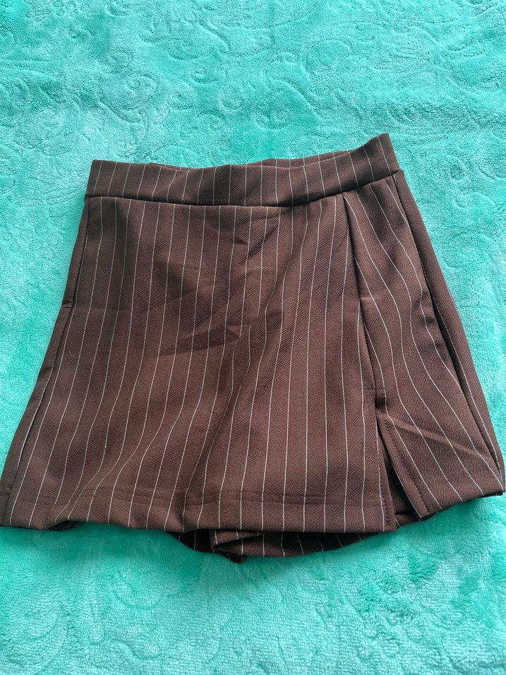 Koyu kahverengi ince çizgili, pilili ve dar kesim mini etek. Sentetik kumaştan, sokak modasına uygun rahat bir parça. Arkası şortludur