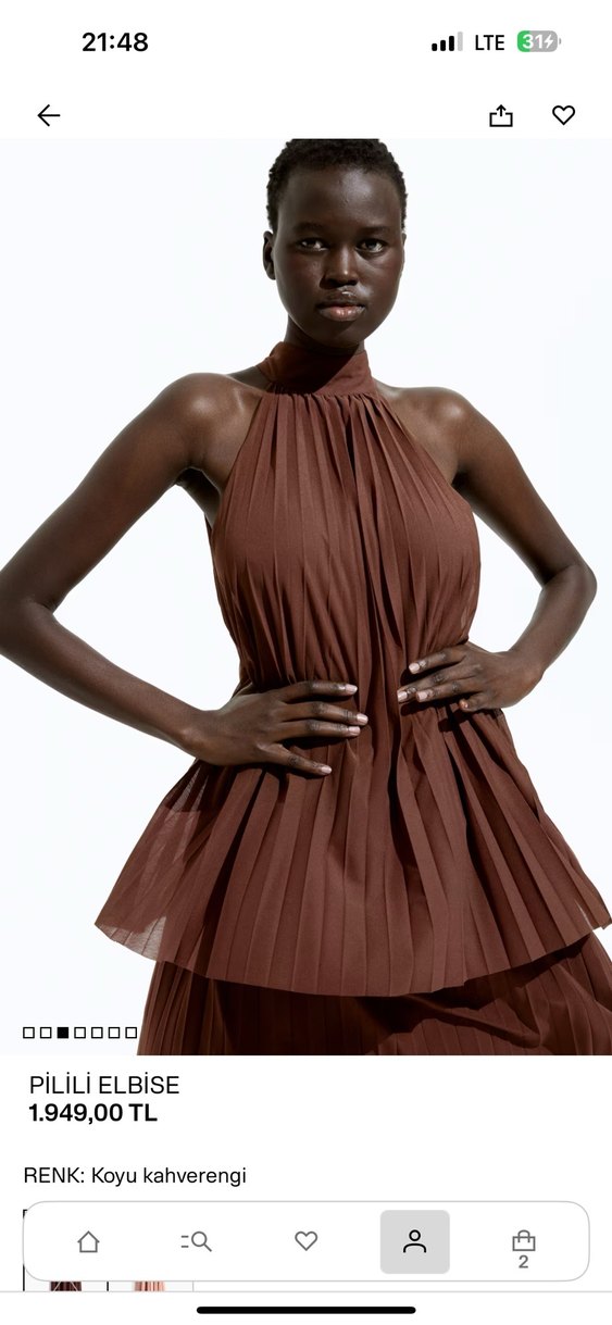 Kahverengi, yüksek yakalı ve pilili detaylara sahip, kısa ve vücuda oturan bu elbise romantik akşamlar için uygundur. Modern ve kolsuz tasarıma sahiptir.