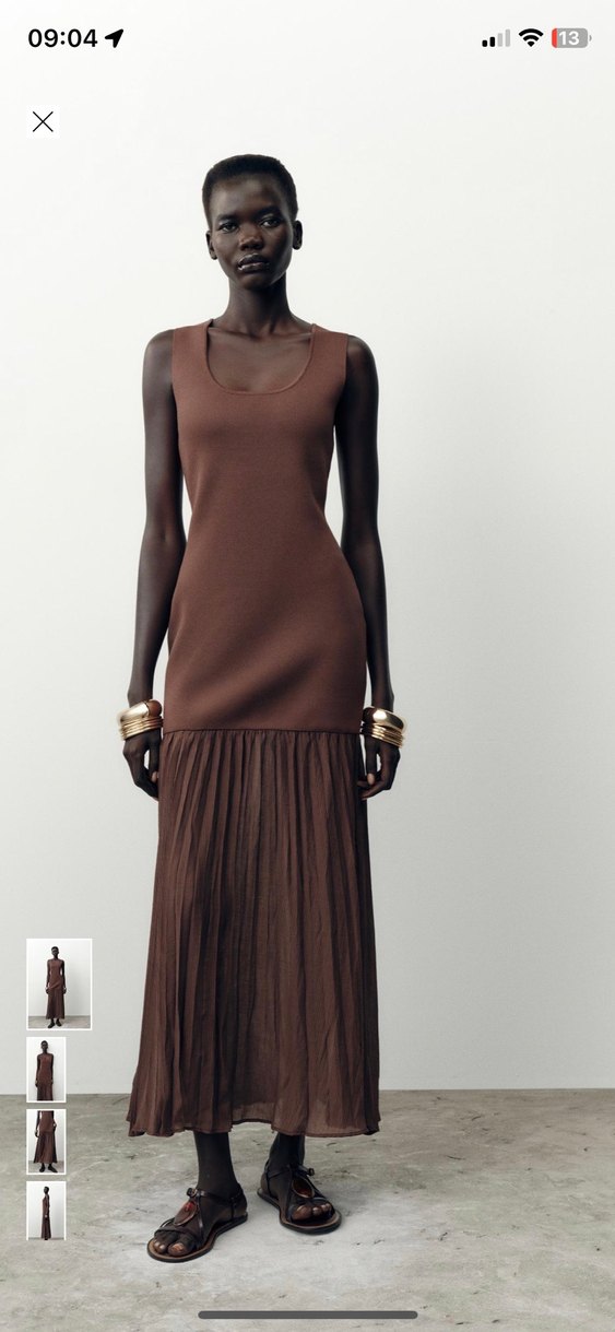 Kahverengi, ince ve uzun, kolsuz elbise, düz kesim ve yuvarlak yaka detayına sahiptir. Alt kısmı pilili olup, günlük kullanıma uygun minimalist ve çağdaş bir tarz sunar.