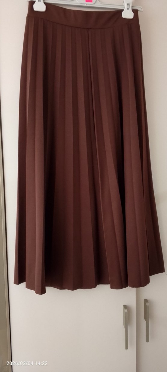 Kahverengi tonlarda, pilili ve uzun kesim kadın eteği. Sentetik kumaştan, minimalist ve çağdaş tarz için uygun, günlük kullanıma ideal.