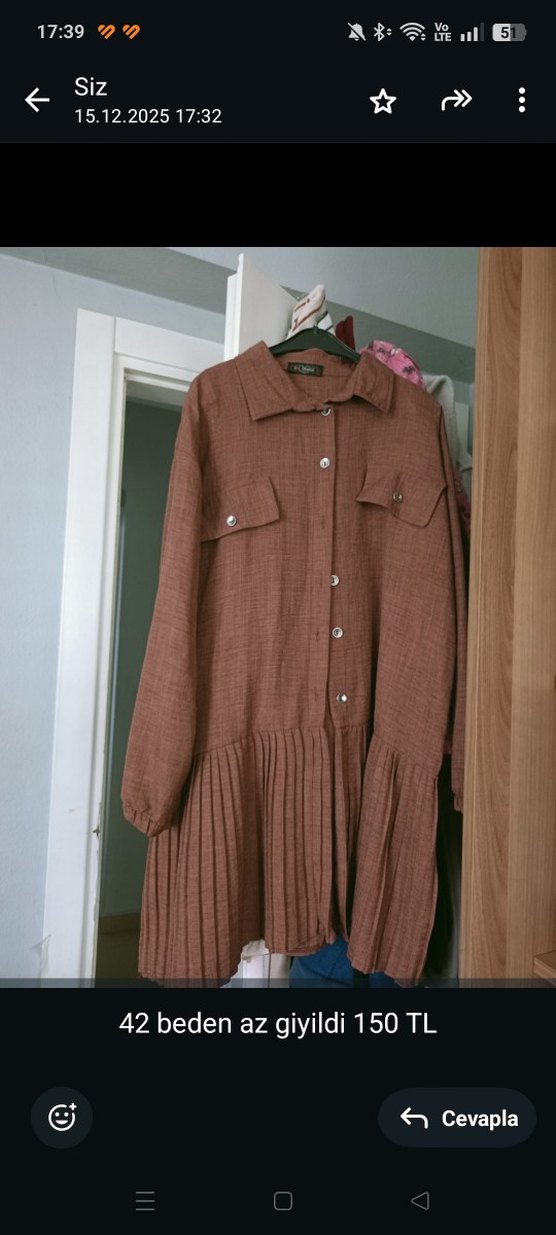 Bol kesim, uzun kollu kahverengi keten tunik, pilili detaylar ve çıtçıtlı yakaya sahip, günlük rahat kullanım için uygundur.