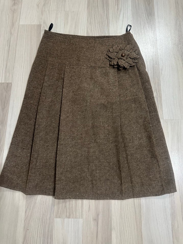 Kahverengi yün hamile eteği, pilili ve bol kesimdir. Midi boyunda, vintage tarzda olup ofis kullanımı için uygundur. Çiçek detayına sahiptir.