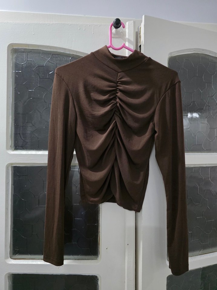 Kahverengi, yüksek yakalı ve uzun kollu, pilili detaylara sahip dar kesim kadın bluz. Sentetik kumaştan midi boyda, minimal ve desen içermeyen tasarım. Günlük kullanım için uygun.