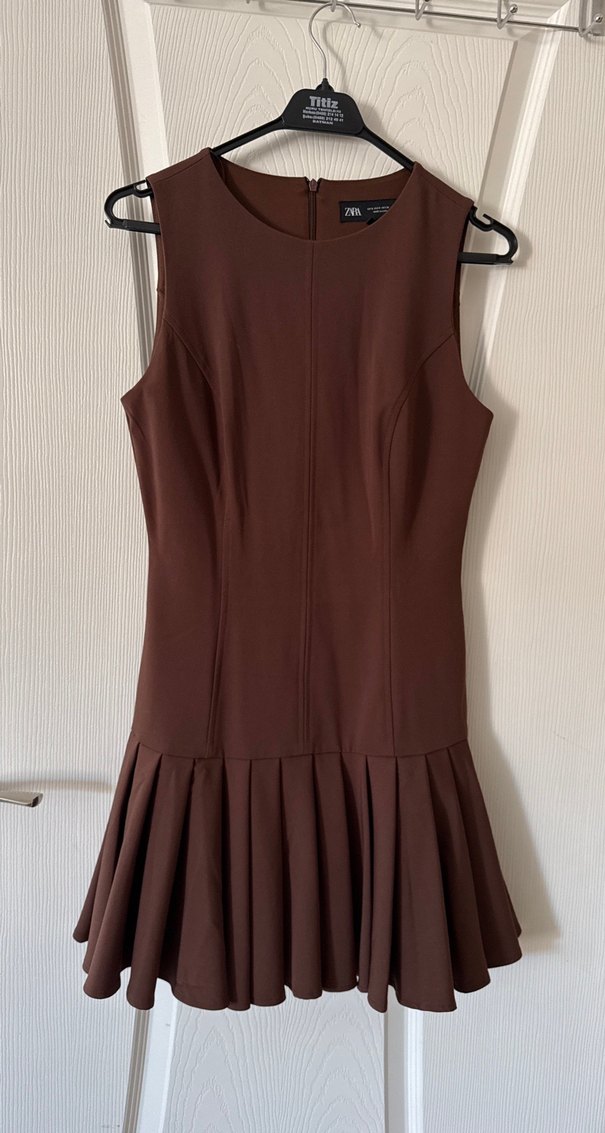 Kahverengi, kolsuz, piliseli midi etekli, bisiklet yaka ve vücuda oturan klasik Paris tarzı elbise.