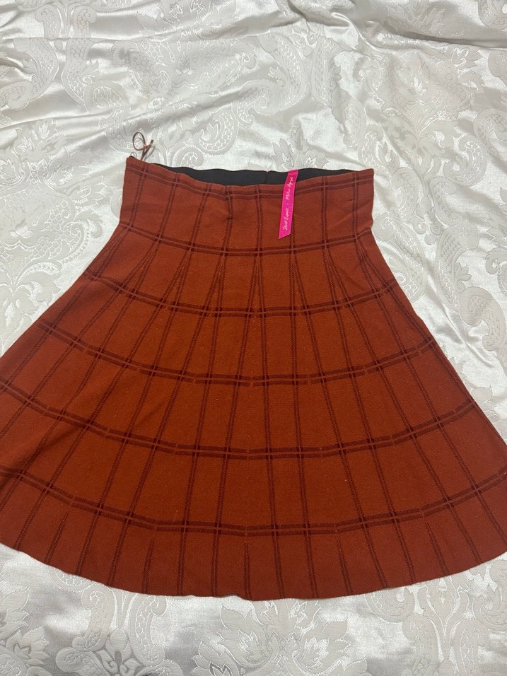 Kahverengi, piliseli ve bol kesim hamile eteği. Sentetik kumaştan, midi boy ve rahat, alternatif tarzda günlük kullanıma uygun.