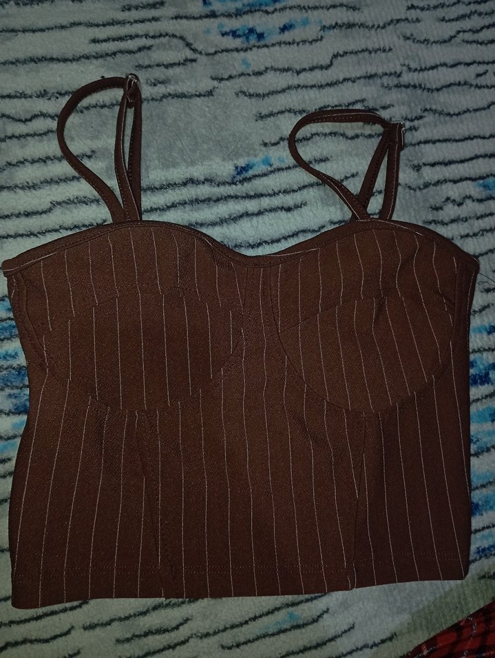 Kahverengi, piliseli ve kısa kesim bustiyer. Askısız, kolsuz ve sentetik kumaştan yapılmıştır, günlük rahat stil için uygundur.