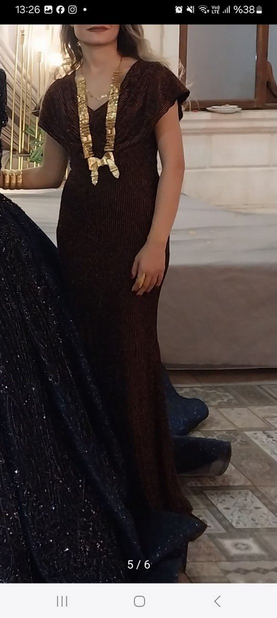 Kahverengi desenli kumaştan, piliseli detaylı, uzun ve vücuda oturan abiye elbise. Kayık yaka ve ince askılı kollarıyla düğünler için uygun. Koton markadır