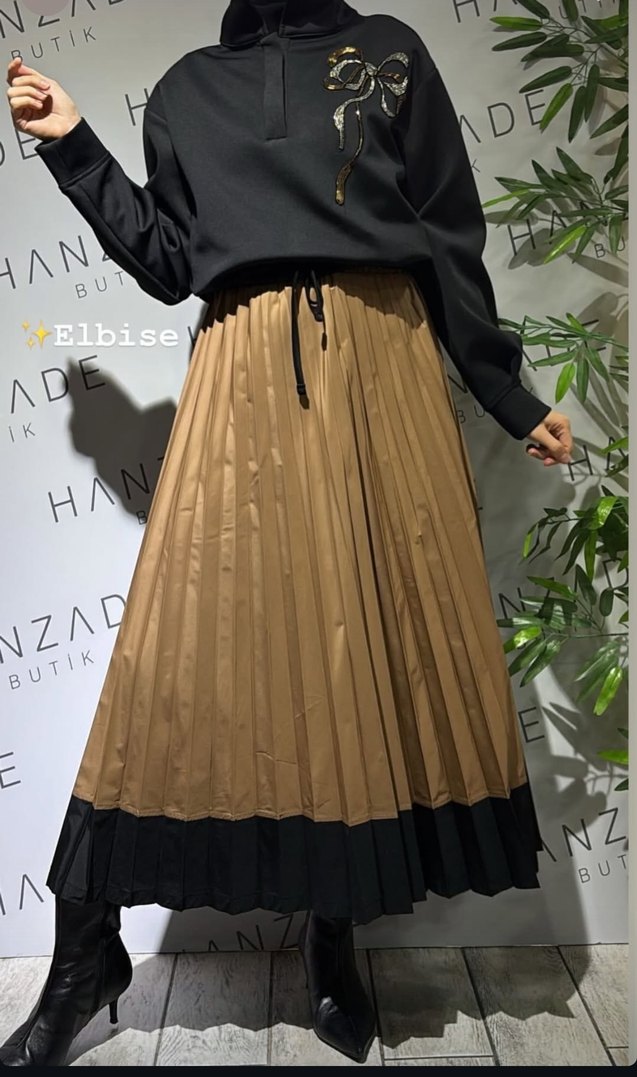 Sentetik kumaştan, piliseli ve bol kesim kahverengi uzun etek. Sokak stili ve günlük kullanım için uygun, baskılı desen ve koyu tonlarda. ✨